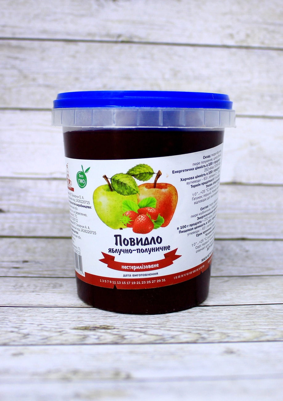 Состав: пюре яблочное, пюре клубничное, сахар, сорбиновая кислота (консервант). Энергетическая ценность - 240 ккал / 100 г, 1056 кДж. Пищевая ценность 100 г: углеводов - 60 г, витамин С - 3 мг. Срок годности - 6 месяцев.