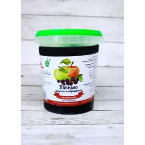Состав: пюре яблочное, пюре черносмородиновое, сахар, сорбиновая кислота (консервант). Энергетическая ценность - 240 ккал / 100 г, 1056 кДж. Пищевая ценность 100 г: углеводов - 60 г, витамин С - 10 мг. Срок годности - 6 месяцев.